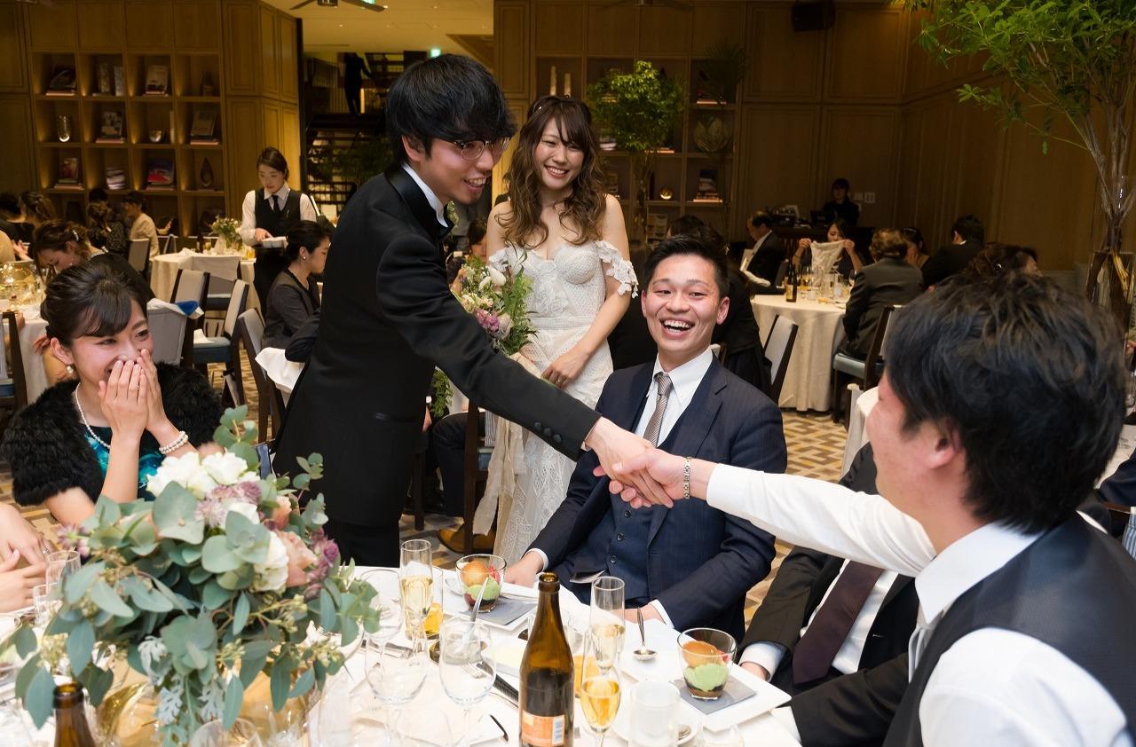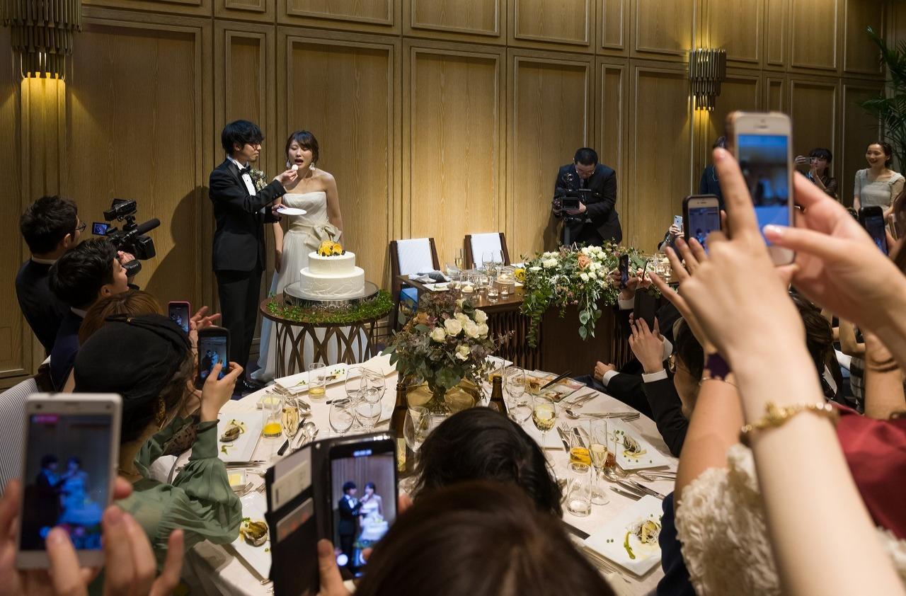 「オープニングのプロフィールムービーで乾杯やスピーチ、余興を行うゲストの紹介も行い、ゲストも主役の披露宴を目指しました」。アップテンポなBGMで入場し、和気あいあいとした雰囲気に包まれたそう。ファーストバイトでは新郎のメガネに生クリームを付けるという、会場中の笑顔を引き出すサプライズで大盛り上がり!