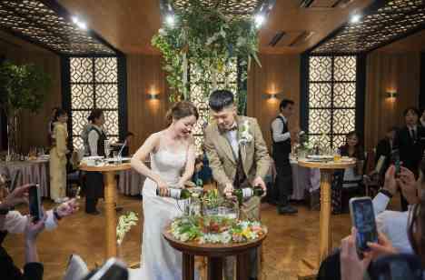 お酒が大好きなおふたり。 ゲストと一緒にお酒を楽しみたいという想いからサングリアセレモニーをご提案。 果物が入った瓶におふたりが白ワインを注ぎ ファーストドリンクとして、新婦が注いだドリンクを新郎が試飲。 新郎の「おいしい!」のお墨付きでゲストの皆様へもサングリアを自由にお召し上がりいただけるよう振舞いました。