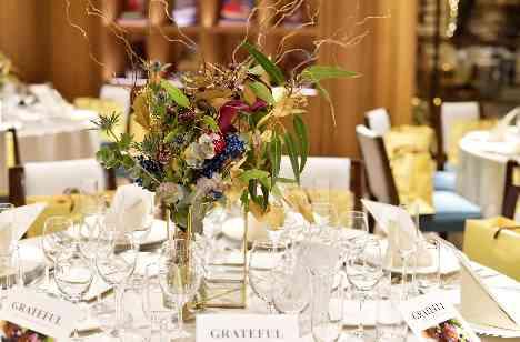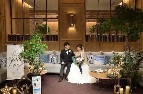大きな花や枝を組み合わせた装花をダイナミックに飾り、ワイルド感のある大人っぽい印象でコーディネート。多くのゲストが集える長いソファスペースを高砂にし、リラックスして自由に撮影のできる雰囲気になりました。「アワビやオマール海老、締めのお茶漬けを追加したワンランク上のコース料理は、贅沢感が満載で大好評でした」。