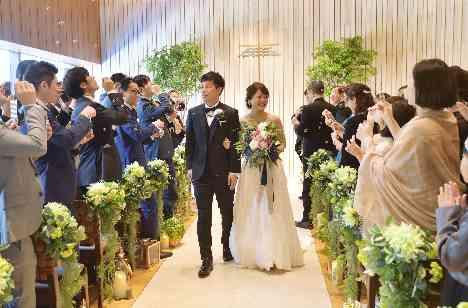 結婚証明書の台紙となる和紙は、提携先の都内の工房に出向いて制作した、こだわりのアイテム。「誓いの言葉のタイミングが合わず、笑いが起きる一幕もありましたが、自然体で過ごす私たちらしいセレモニーになり大満足です」。クライマックスの退場では、チャペル内にバブルシャワーが舞い、より写真映えするワンシーンに。