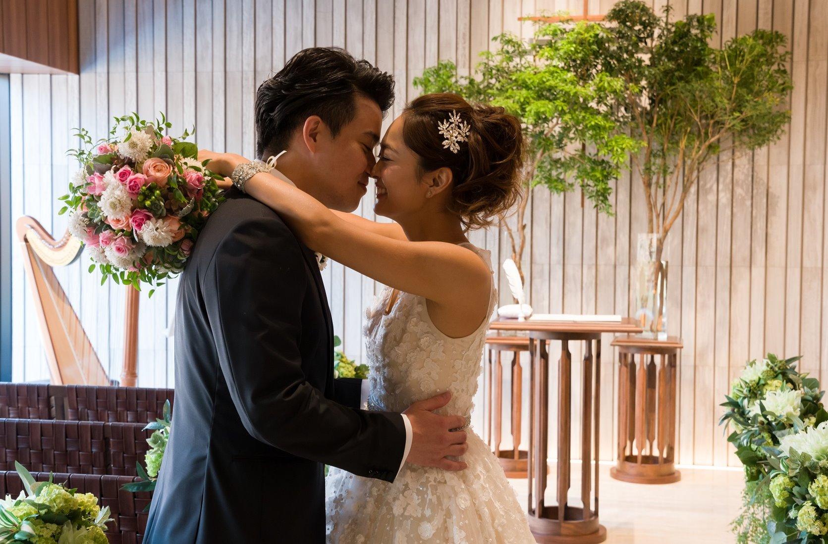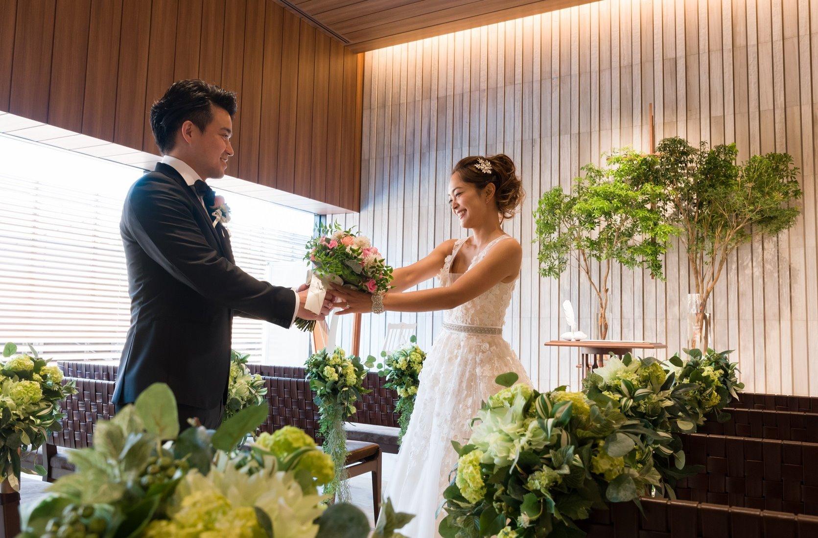 親しい人だけをよんだ温かな挙式。グリーン装飾が綺麗に映え、自然光もたっぷりと降り注ぐ空間だからこそ叶えられる挙式に。