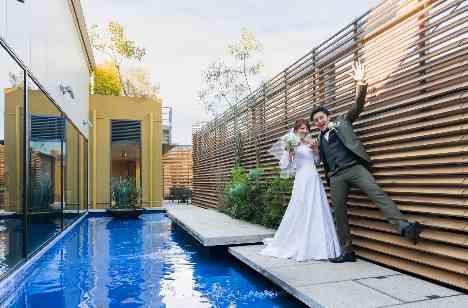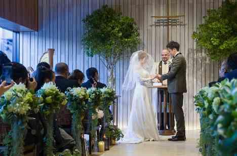 水と光、緑に囲まれたナチュラルなデザイナーズチャペルが舞台。一面の窓の外にウォーターテラスを望む、開放的なデザイナーズチャペルで挙式。降り注ぐ自然光とたくさんのグリーンがナチュラルな雰囲気を演出し、純白のウエディングドレスがいっそう引き立った。「入退場の時には希望していた曲をハープで生演奏してくださいました」。挙式後はチャペル内でゲスト全員との記念撮影も。