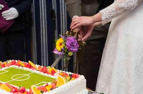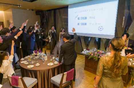 オープニングはオリジナルムービーの上映で華やかに。ふたりが好きなサッカーをモチーフにしたインパクトあふれるケーキが登場し、ゲストへのサンクス&ハピネスバイトで感謝を伝えて幸せをおすそわけした。「ゲストに小さな子どももいたので、お子様メニューやアレルギーの方に配慮した料理もしっかり相談できてよかったです」。
