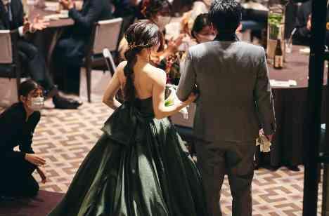 カラードレスはブエノスコートの雰囲気にぴったりのトレンドカラー「深みのあるカーキ」をチョイス。 大人っぽさもありながら、ふんわりとしたAラインに、光沢も上質に感じられる1着。このカラードレスはTHE TENDER HOUSEだけのオリジナルドレス。ドレスショップは「Dress District」。国内外のインポートドレスも取り扱いあり。