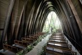 - 天井高10mの広々とした堂内には天然の木の香りが満ちていて幾重にも重なる虹のアーチは希望と幸せの象徴