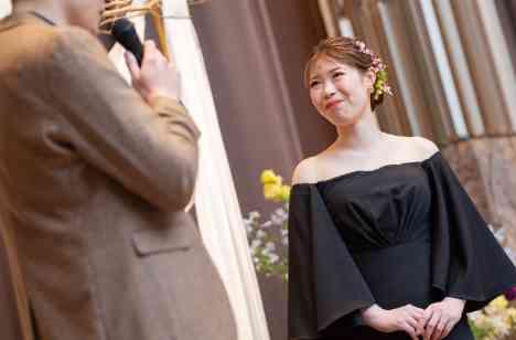 「プロポーズを形としてできていないから、しっかりと言葉にして気持ちを伝えたい」という素敵なお気持ちから始まったサプライズ。 当日は、新郎新婦様とご親族の皆様で「プロフィールDVD」をご覧いただいたあと、司会者から「本日新しいストーリーが綴られます」のコメントをきっかけに、サプライズの進行がスタート。新郎様も涙を浮かべながら、お花束に新婦様への愛と言葉を添えてお渡しいただきました。