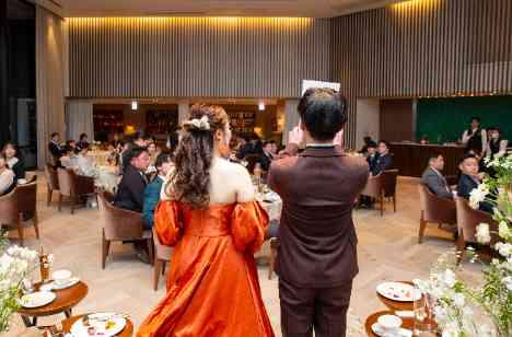 ゲストとの時間を長く取りたいとご希望されていたため、歓談のお時間は必須。各テーブルの方とお写真を撮る時間も取りました。お写真を撮るだけでなく久しぶりに会うご友人様とお話をする時間を設けられるように進行を決めさせていただきました。短く感じてしまう披露宴をできるだけ長く感じていただきたく、ゲストの方も楽しんでいただけるような披露宴になりました。