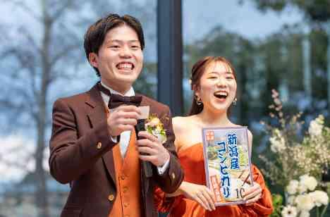 おふたりの披露宴の中で一番のメインは再入場BGM当てクイズ。受付で投票していただき当たりの曲に投票した方へ抽選で豪華な景品をプレゼント。それだけではなくハズレの曲に投票したゲストの中からは残念賞の用意も!どの曲を選んでも最後まで楽しんでもらいたいというおふたりの想いが込められた演出。残念賞は王様じゃんけんで残った1名に景品プレゼント。最後まで盛り上がるクイズでした。
