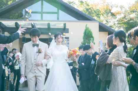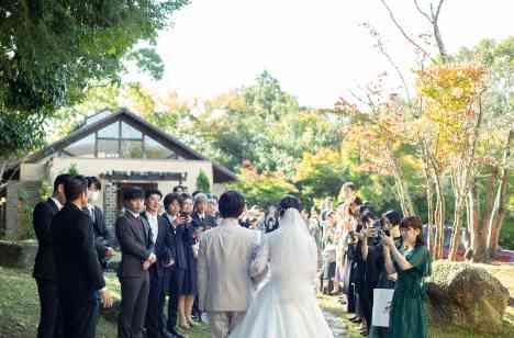 お二人の共通項は【自然】。奈良で結婚式をすることを決めた時に一番に感じて欲しかったことは、奈良らしい自然だった。本物の自然に囲まれた会場だからこそ、紅葉が美しい時期をチョイス。美しい景色の中で迎えたことによりみんなの心に残るセレモニーに・・・独立チャペルだからこそ外で開放的にフラワーシャワーのセレモニーができるのもヒルトップテラスならでは。