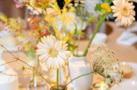 ゲストの皆様が披露宴会場へと進まれる際に、真っ白なお花を一輪取っていただきゲストテーブルの花瓶に入れていただく。そこには仕掛けがあり、おふたりの心がどんどん満たされていくように、お花も色づいていく。おふたりが選ばれたオレンジ色にお花が染まり、おふたりの表情も晴れやかになり、会場全体が笑顔が咲き誇りました。