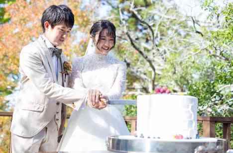おふたりが結婚式をする上でゲストの皆様に一番感じてほしかったのが”奈良の自然”でした。それを感じられることが大きな決め手だった。たいせつなゲストの皆様と”奈良の自然”に囲まれながらできるよう、待合室のテラスでご提案。快晴で自然とゲスト皆様に囲まれ、笑顔いっぱいで入刀をされており おふたりらしさが詰まっていました。