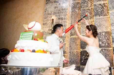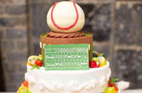 パティシエと共に考えたオジナルのウェディングケーキ。新郎様の好きな野球をモチーフに。野球ボールもパティシエのお手製です! ファーストバイトのBGMは「狙い撃ち♪」手作りのバット型スプーンをお持込されて、おふたりらしい演出で盛り上がりました!誰もやっていないことがしたい、という新郎新婦様の想いが叶った演出です。