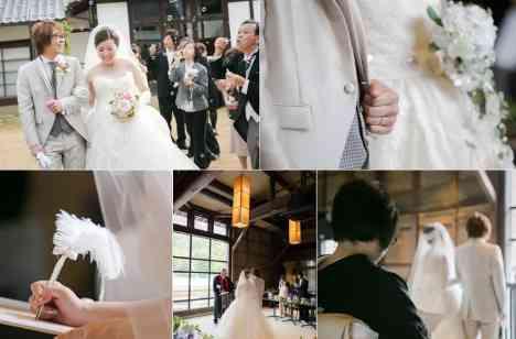 歴史ある場所で、心に残るセレモニーを。400年の歴史ある酒蔵を貸し切りにして、キリスト教式を挙げられたおふたり。眼前に竹田城跡がそびえる大窓をバックに、指輪交換、誓約書へのサインを行い、永遠の愛を誓われました。ピアノと声楽による讃美歌が流れる中、ゲストがハンカチで目頭を押さえるシーンも。ご家族に見守られながら、また新たなご家族がここに誕生しました。