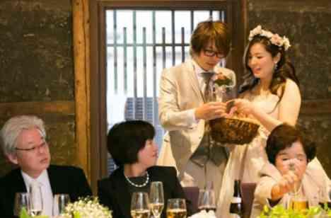 お中座は、新郎様新婦様ともに、大好きなおばあ様のエスコートで。サプライズの演出に、思わずうれし涙のおばあ様方。お色直しで髪をダウンスタイルにされ、ピンクのサッシュベルトでアレンジした新婦様と、優しく寄り添う新郎様。おなかの赤ちゃんと一緒に、フラワーサーブで各テーブルを回ります。選ばれたお花は「感謝」の花言葉を持つピンクのガーベラ。新しいご家族としての第一歩を踏み出されました。