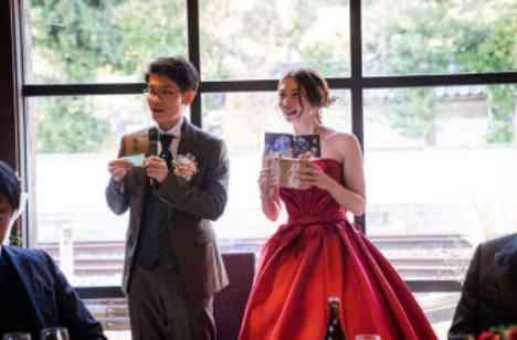 ご家族との会食後は、ご友人を中心にお招きされました。おふたりも自由に動き回りながら、ゲストと会話を愉しまれました。おふたりが沢山の愛に包まれているのを感じる素敵なお時間となりました。ゲストの方も参加型で愉しんでいただいたのが、おふたりのことをより知ってもらう新郎新婦クイズの演出。ウエルカムスペースに投票型のクイズを2問設置し、正解された方にはインタビューをされました。
