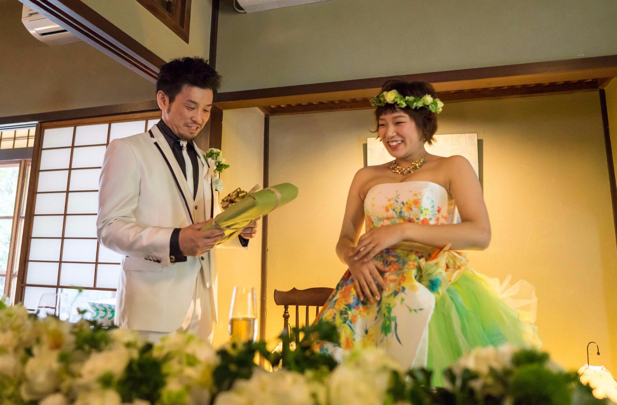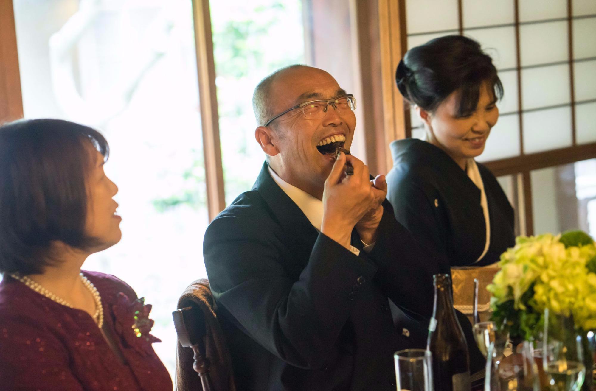 少人数だからこそ、メインテーブルのおふたりとゲストとは、食事をしながらも歓談できる距離感を大切に。幸せそうなおふたりをはじめ、両家の仲もぐっと深まって会話もお料理もすすみます。そんな穏やかな雰囲気に包まれ、会場はまるで食卓を囲んでいるかのようなアットホームな空間に。これから笑顔の絶えないおふたりのご家庭が目に浮かびました。