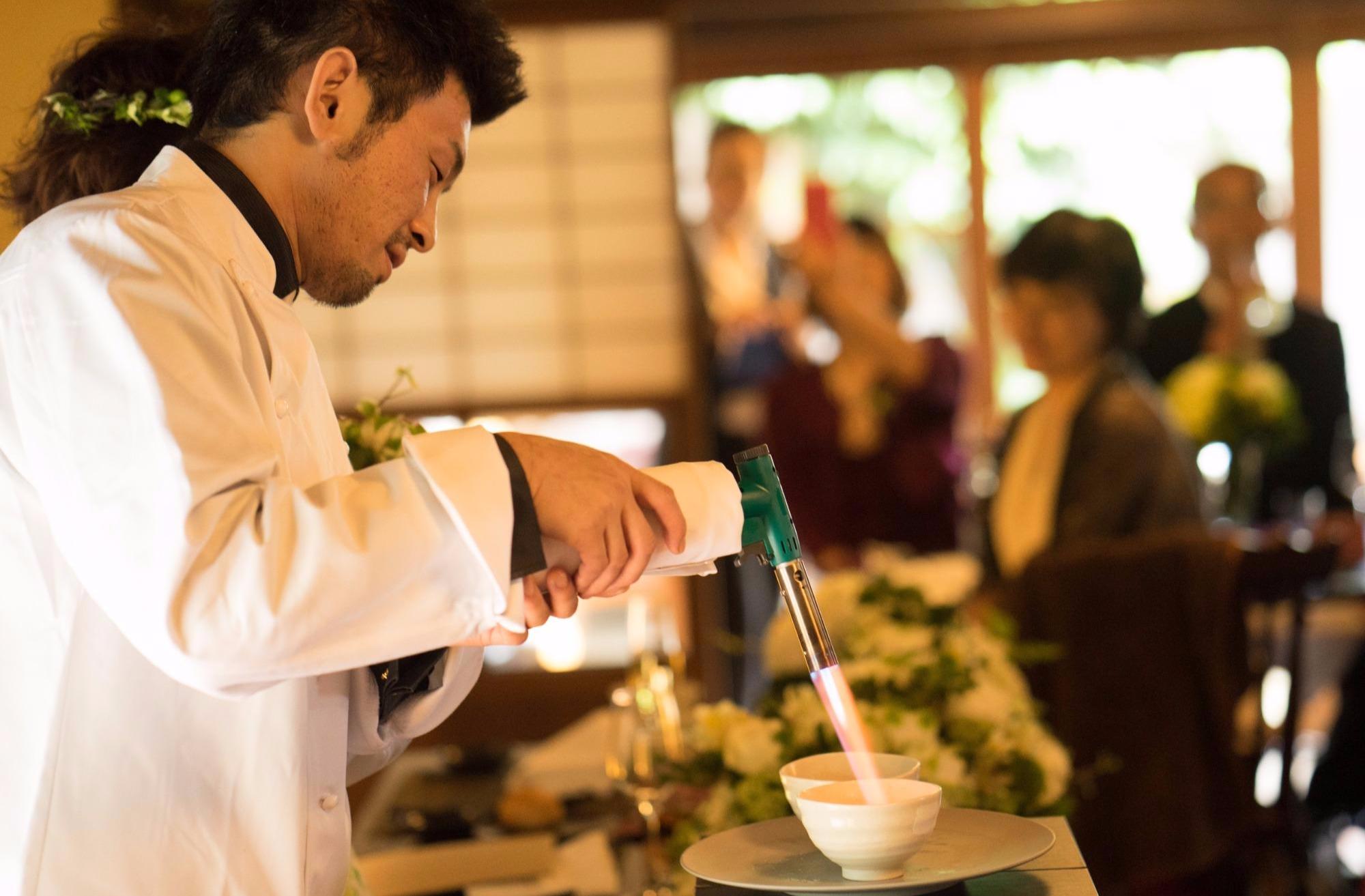 当日のお料理は、料理人である新郎様と一緒に作り上げた特別コース。地元の友人から年配のゲストまで大満足の笑顔があふれます!しかしまだ終わりではありません。食後は新婦様がプレゼントされたコックコートを着てゲストに感謝の気持ちをこめたデザートでおもてなし。目の前でブリュレの表面を炙る演出には会場も「おおっ!」と大盛り上がり!直接口にするものだからこそ、とことんこだわって感謝の気持ちをお届けしました。