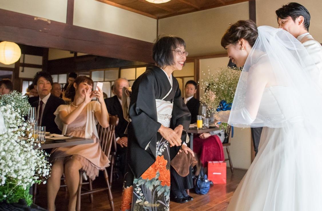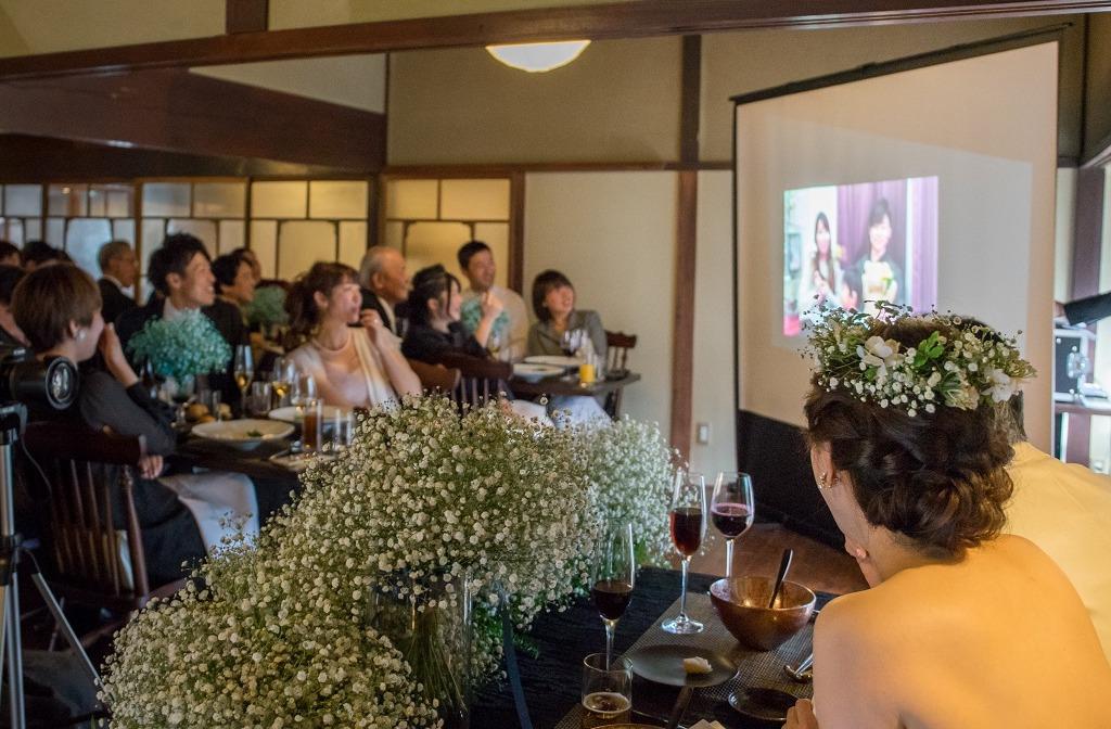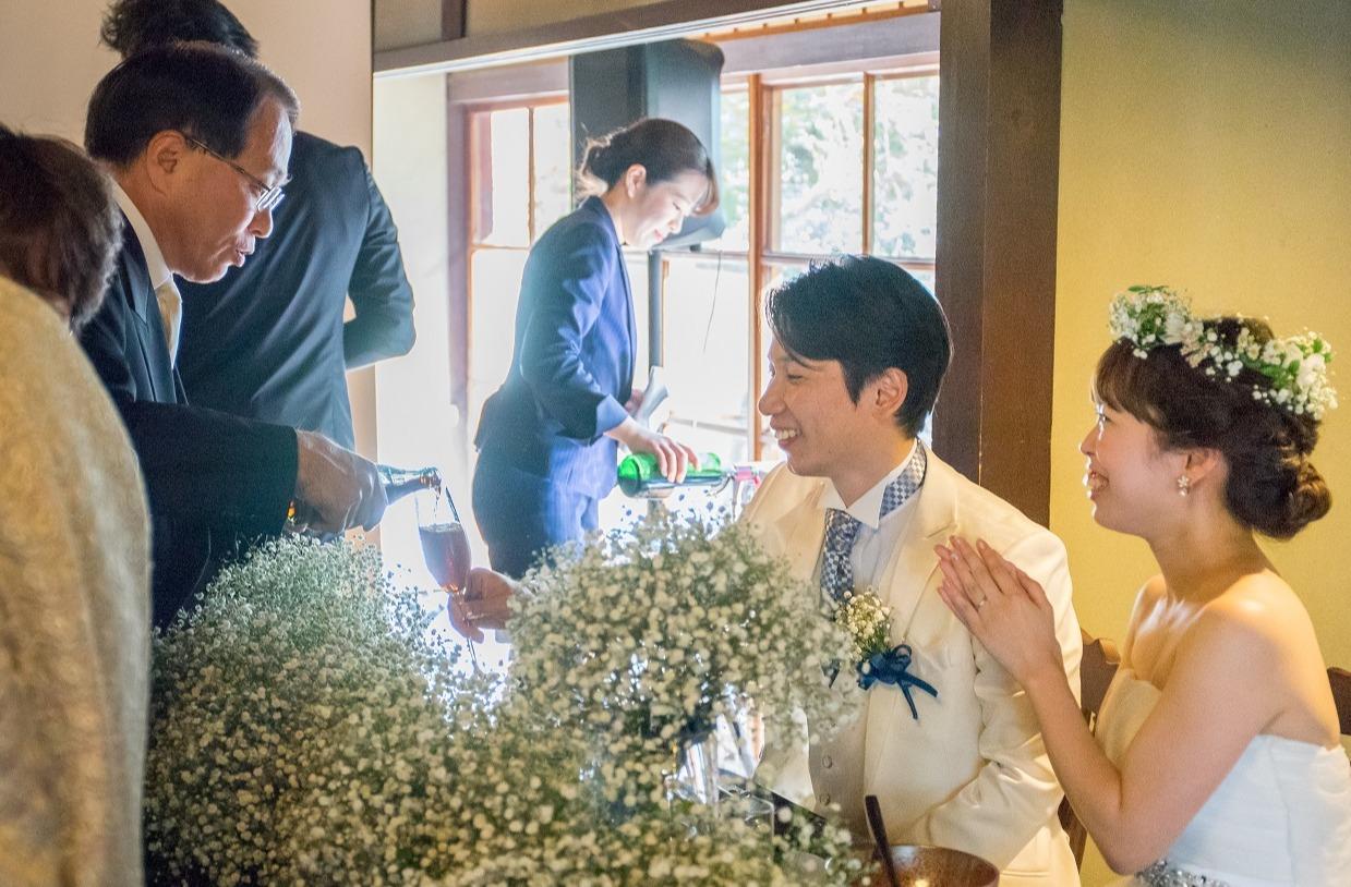 「純白のかすみ草」をゲストから1輪ずつ受け取り、新郎様がブーケを作ることから始まった挙式。親しい方々に囲まれてリラックスしたおふたりが誓いの言葉を。指輪の交換・立会人をご家族が行うアットホームな式に、ゲストの顔も思わずほころびます。古民家の時を経て磨かれた木の質感が、新しい夫婦の誕生をあたたかく見守りました。