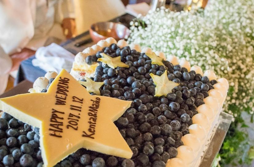 お色直しに合わせて、テーブルのカスミソウがブルーに変わるオリジナル演出がこだわり。 おふたりの距離を縮めるきっかけになったバンドが楽曲提供をしていた映画からヒントを得て、披露宴会場はブルーをコンセプトカラーに、星型のモチーフをあしらった空間に。ウエディングケーキもブルーベリーをたっぷり使用しトータルコーディネート。 ゲストと思い出を共有する素敵な演出になりました。