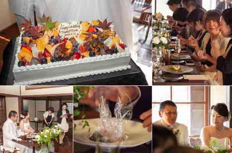 おふたりが何より大切にされたのがお料理。イチジクやぶどう、柿、栗など秋の味覚がたっぷり使われたウエディングケーキは“実りの秋”のコンセプトにふさわしい仕上がりです。「こんなに笑顔になれた時間と場所が心から幸せでした。篠山の地ならではの美味しいものでお客様をもてなし、寛いだ雰囲気でテーブルを囲む。お互いに気持ちを伝えあう素敵な一日になりました。