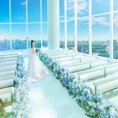 【東京タワー一望のスカイチャペル】地上215mで東京タワーや皇居を眺められる贅沢な空間。ガラス一面から自然光がたっぷりと差し込む天空チャペル。東京の夜景が広がるナイト挙式では上質で感動的なひとときを。