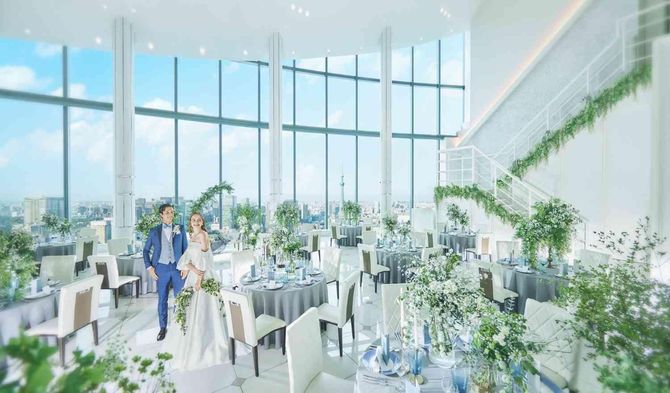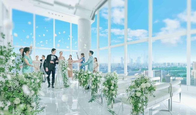 地上215mに位置する天空のチャペルは、大理石のバージンロードに陽光と空が映りこむ幻想的な空間。東京タワーを望む絶景と、透明感あふれる光のヴェールに包まれながら、まるで空に浮かんでいるかのようなロマンティックな時間をお過ごしいただけます。