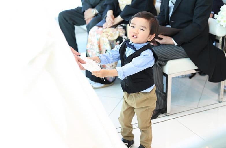 新郎様の甥っ子がリングボーイの大役を務めます! リハーサルでは緊張していた様子でしたが、本番ではカッコよく決めてくれましたね♪