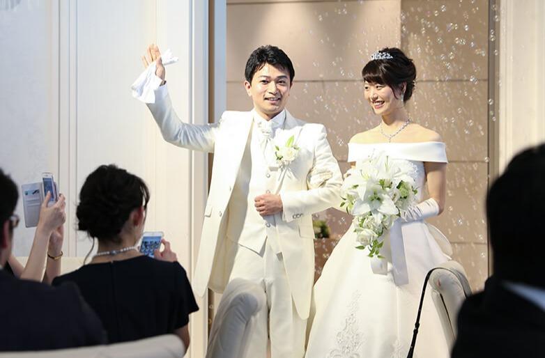 新郎様こだわりのバブルシャワー演出でご入場。 キラキラしているおふたりの姿に会場中が笑顔で溢れました♪