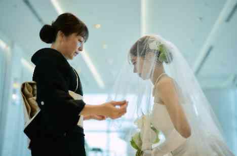 挙式本番、新婦様はお父様にエスコートされながらご入場を。そして挙式会場の中で待っていたお母様に、花嫁の身支度ともいわれるベールダウンをお手伝いいただきました。その後ゆっくりとお父様といっしょにバージンロードを歩き出した新婦様。そんなおふたりの後ろ姿をお母様が優しく見つめていた姿がとても印象的なシーンとなりました。
