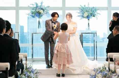 挙式本番、新郎新婦様の指輪の交換のシーンではお子様ゲストがリングガールを務めてくれました♪ゆっくりとバージンロードを歩きながら指輪を新郎新婦様の元まで届けると、祭壇の上にあがっていざおふたりが交換するときもお手伝いを。可愛いお子様に1番近くで指輪のセレモニーを見守っていただき、おふたりもにこにこの笑顔が印象的でした♡