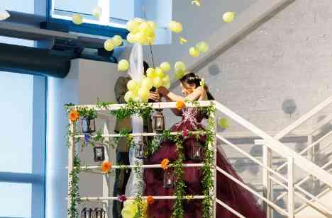 お色直しをされて階段から入場されたおふたりは、階段の踊り場で次の演出へ。そこに用意されていたのは白く大きなバルーン。新郎新婦様が息を合わせて白いバルーンを割ると、中からは黄色い小さなバルーンがいっぱいに空を舞います。 当館では幻想的な空間になることが多い階段での入場シーンですが、スパークバルーンによって楽しく盛り上がる入場シーンとなりました♡