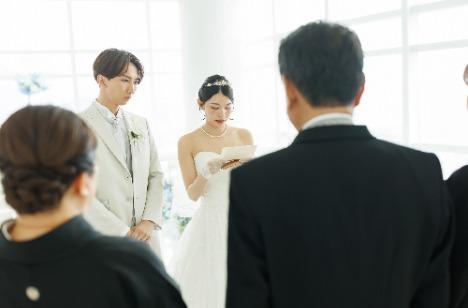 新婦様から親御様への手紙は、披露宴中ではなく挙式の前にチャペルにて読まれました。あえてゲストの皆様の前ではなく、親御様だけをチャペルにお呼びし伝えられた感謝の想い。これから始まる結婚式への緊張と、当日を迎えることができた喜び、そしてそんな新郎新婦様を優しく見守る親御様の笑顔がとても印象的な、温かい時間でした。