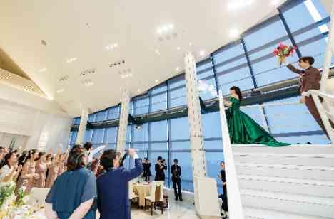 ブラウンのタキシードと、鮮やかな緑のドレスに身を包んで登場されたお色直しのご入場♪新郎新婦様がお洒落な装いで会場内の階段から登場されると、ゲストの皆様から歓声が。そしておふたりは階段の途中でパラシュートベアを発射!バズーカ型のクラッカーからパラシュートのついたくまのぬいぐるみが発射され、ふわふわと揺れながらゲストの元へ降りていきます。年代を問わず楽しむことができ、見た目もとっても可愛い演出です♡