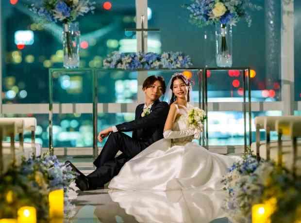 いろいろな会場を見学し悩まれた末に、アクセスの良さと会場から見える景色を気に入ってくださり当会場に決められたおふたり。前撮りも当館での撮影を選ばれ、昼間の太陽が夕日となり、後に夜の景色へと変わっていく幻想的な空間で、ゆったりと写真撮影を楽しまれました。素敵な写真の数々は結婚式当日のウェルカムスペースの装飾や、ゲストの皆様へ配るペーパーアイテムに…♡