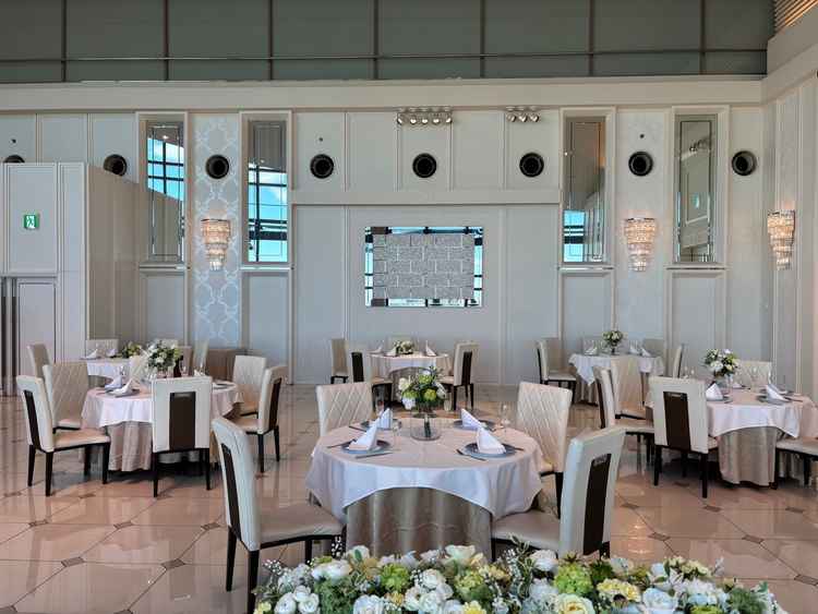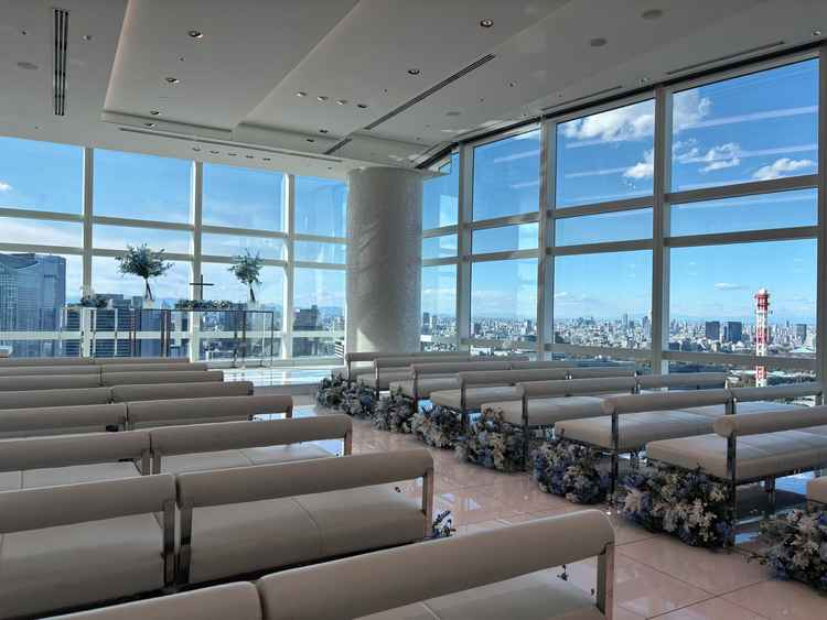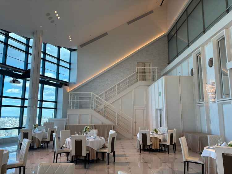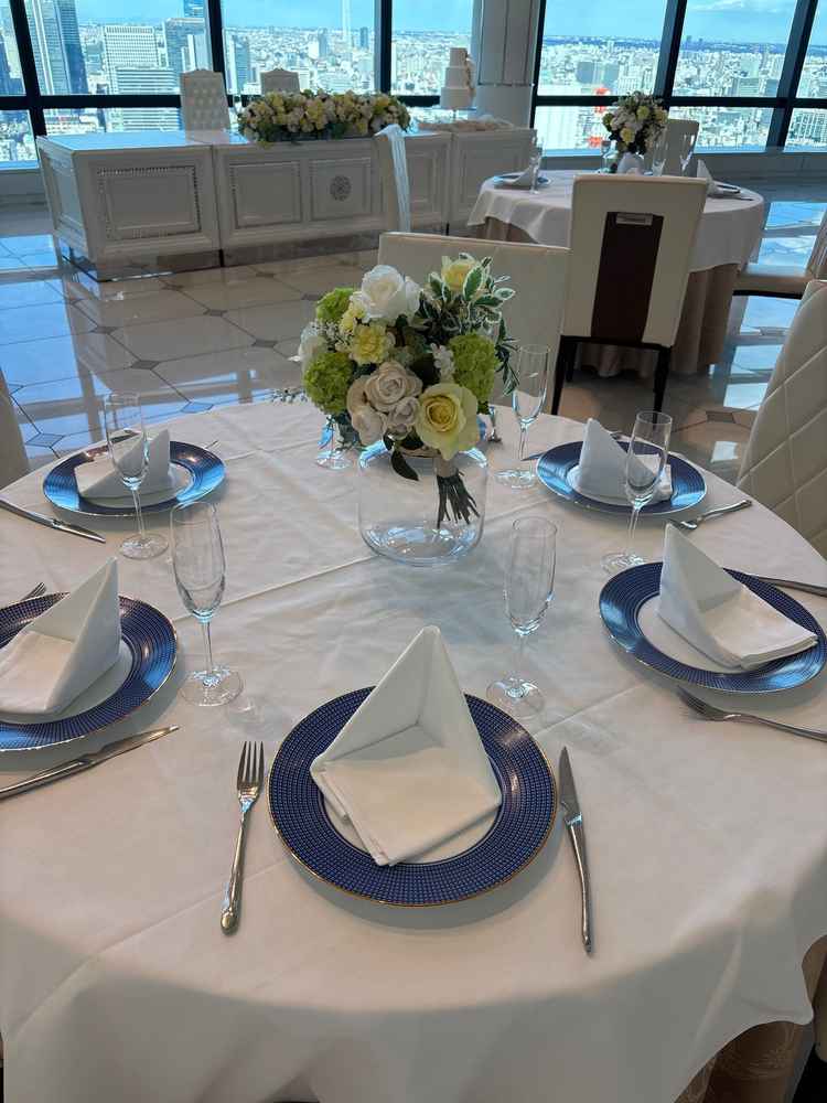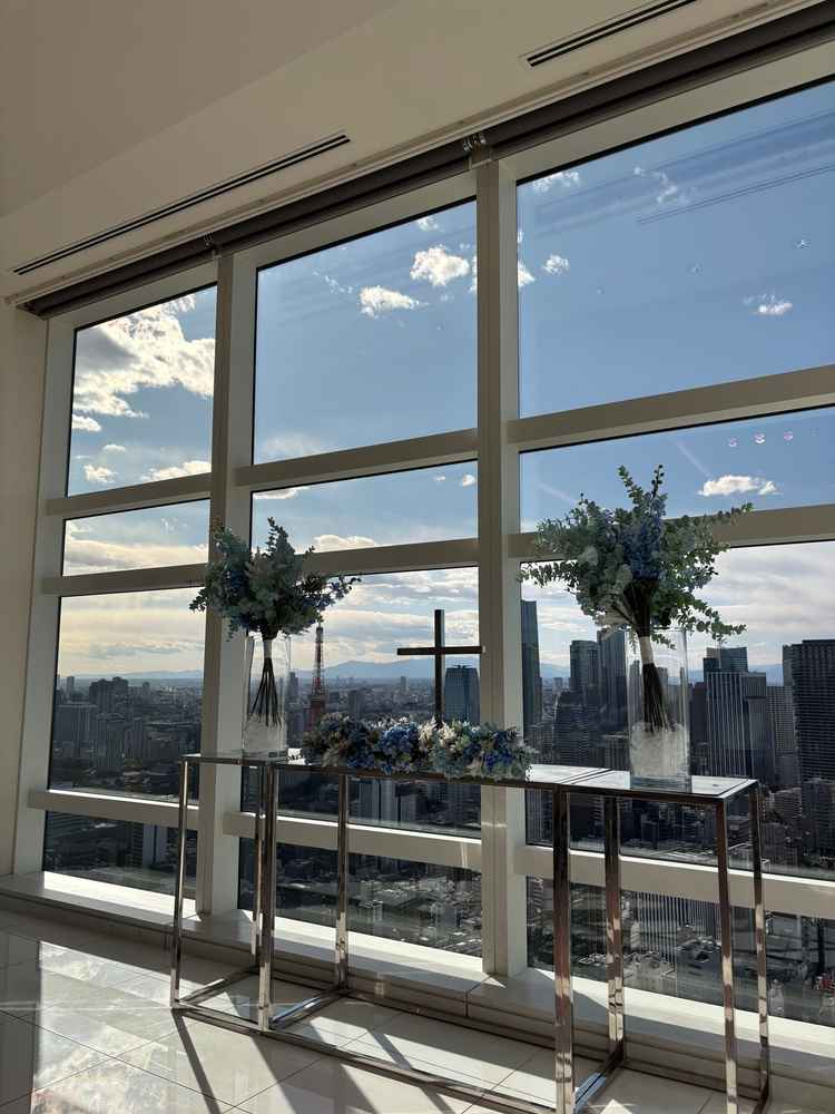 シンプルで上品な雰囲気。花で豪華にするか、そのまま生かすかは人によると思います。とにかく景色がよく、ナイトウエディングが良いかと思ったが日中のほうがビル群がよく見えて好みだと思いました。