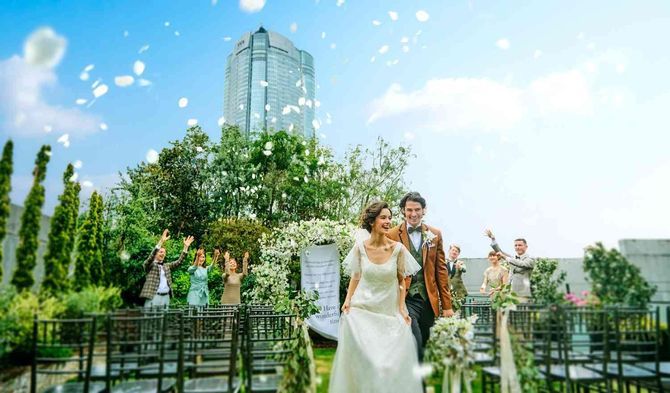 海外挙式をイメージさせるガーデンチャペルと室内チャペルをお好みに合わせてチョイスできる。生演奏やバブルシャワーなど自由度の高い演出もOKだからふたりのイメージもきっと膨らむはず。天候に合わせて室内チャペルに切り替えもできるから安心して。