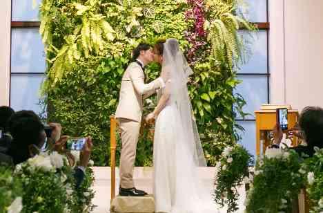 お二人が描く”笑いのある結婚式”で特にこだわったのが挙式でのウェディングキスシーン♡実はご新郎様がとても小柄でご新婦様はスタイル抜群の高身長!!普通にウェディングキスをしてもつまらないとのことで身長差を生かして当日は踏み台を使用して、ウェディングキスを行い笑いを交えることにしました!この光景をゲスト様は満面の笑みで温かく見守ってくださいました!!