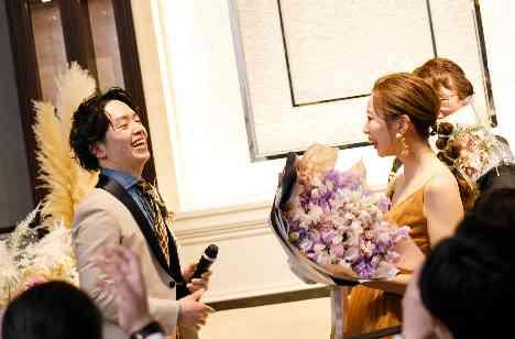 終始、笑顔が絶えない結婚式となり、明るい時間帯から始まった挙式は披露宴が開宴したと共にプライベートガーデンがイルミネーションも輝く中で大人なロマンチックな空間にて、春のシーズンだからこそ季節にちなんだお花でサプライズを決行することに!!淡いピンクのスイートピー100本の花束はご新婦様の心にしっかりと届いておりました!!末永くお幸せに♡