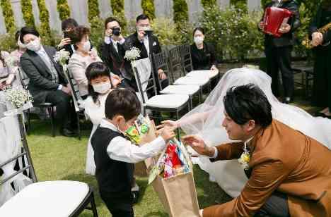 挙式のセレモニーは指輪交換のタイミングでリングキッズの登場♡ご新郎様の姪・甥にご登場いただき会場全体もとても和やかな雰囲気に包まれておりました!! また頑張ってくれたリングキッズには御礼としてお二人がご用意いただいたお菓子の詰め合わせをお渡しして御礼を伝えました!挙式直後のアフターセレモニーではテラスでゲスト全員で集合写真の撮影で皆様の記憶に残る1ページを刻みました!