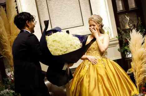 披露宴の結びには新郎様から新婦様へ感謝のお気持ちを込めて、こだわって選んでくださったゴールドのドレスに映える白バラ100本のサプライズを。 「100%の愛」という意味合いもある100本バラのサプライズに、普段はあまり泣かないという新婦様の目にも涙が。 会場全体が感動で包まれるとても素敵な瞬間となりました。