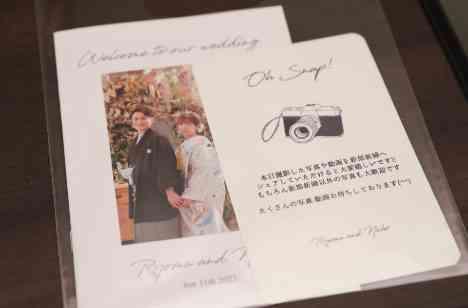 今回のご結婚式でお二人は様々なアイテムをお手作りされました。 エスコートカードには「シーリングスタンプ」を使用し、見た目もオシャレな仕上がりに。 アクリルで作った席札は、一人一人のお名前をローマ字で記載したデザインでゲスト様にも大変喜んでいただけました! さらにプロフィールブックは、「結婚式が結んだら食べたい物」など、お二人らしさの詰まった素敵なプロフィールブックになりました。