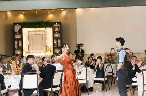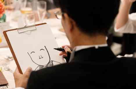 ゲストの皆様に楽しんでいただくため、全員参加で行った演出は「新郎新婦様の似顔絵大会」! 新郎新婦様の似顔絵をテーブルの中で描いていただきました。 可愛い似顔絵からユニークな似顔絵まで、様々な視点からの似顔絵に新郎新婦様も大喜び。 お二人が選定した似顔絵を発表し、お二人から素敵なプレゼントをお渡ししました。