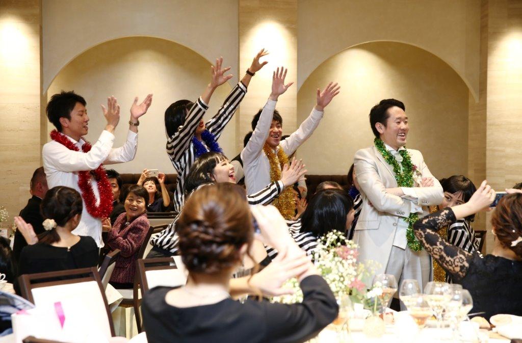 披露宴の目玉はお二人の会社同僚の皆様によるご余興! 新婦様とゲスト様には内緒で、新郎様が合流して一緒にダンスをするサプライズも!!会場はこの日一番の大盛り上がりでした! 笑顔溢れるご披露宴も終盤へ… 親御様へのお手紙のあとはご自身の親御様へ感謝をこめて花束を… そして「これからよろしくお願いします」の想いをこめて、お相手の親御様にはお茶碗をプレゼント。 温かいご披露宴となりました…♡