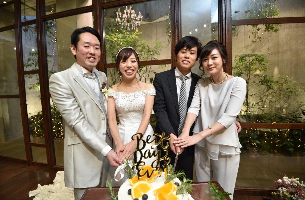 ご披露宴最初のセレモニーは定番のケーキ入刀♡ 新郎新婦はじめての共同作業・・ではなくなんと! ご結婚が近い新婦弟様ご夫婦とご一緒に、4名様での入刀です!!! 思いもよらぬサプライズにびっくり、そして最高にうれしそうな弟様ご夫婦でした!