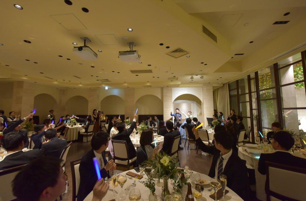 2部の再入場では、お二人の憧れのカラードレスの色当てゲームを!投票ではなく、皆様に正解だと思う色のケミカルライトを振っていただく演出にしました♪ 扉を開いてお二人もビックリ!なんと、ほとんどの方が正解!ゲストの皆様とお二人の仲の良さが伺えましたね♡