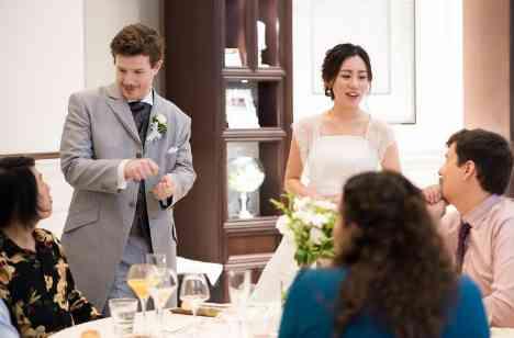 ウェルカムスピーチは新郎はあえて日本語で、新婦は英語でお話しました。お互いの国の言葉を交えての挨拶に、ゲストの皆様も思わず笑顔に。食べる事が大好きなお2人。夫婦として生活する上で、食の時間を大切にしたいと考え、結びにはご両親にも日本製のお茶碗をプレゼントしました。