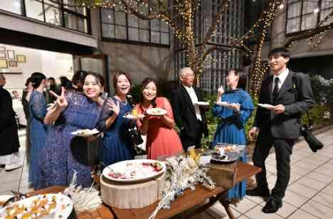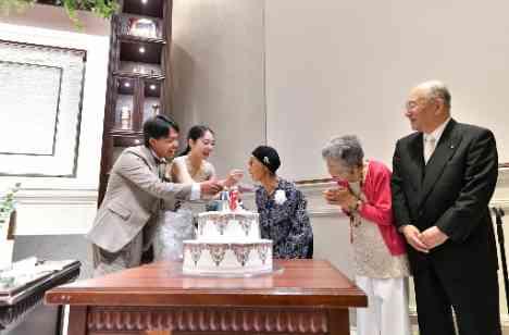 テラスからのご入場でパーティはスタート。 お二人からの挨拶、乾杯と進みケーキ入刀へ。ファーストバイトも終了したタイミングで、サプライズ演出! 今までお世話になったおじい様、おばあ様にありがとうの気持ちをこめて、お二人からのサンクスバイトを行うことに! 恥ずかしながらも皆様お二人からの感謝の気持ちを受け取っていただき、会場も和やかな雰囲気になりました。
