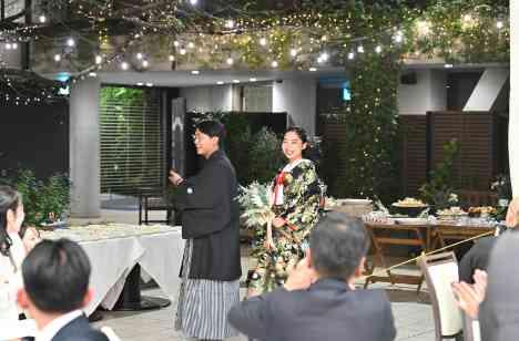 再入場もテラスからの入場! そしてお色直しは洋装ではなく和装! ご新郎様が和装を強くご希望されていたそうです。 ご新郎様が海外の方ということもあり、ご参列の方の中にも海外の方がいらっしゃったため、日本の結婚式らしくお色直し後は着物でおもてなしをすることに! 洋装とはまた違った華やかさに会場全体も感動であふれました。