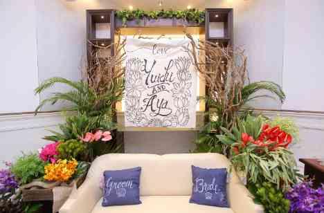 会場装花のイメージももちろん「海」!!!そしてお二人が会場の中でこだわったのは「海」に加えて「ゲストとの距離」!高砂だとお二人とゲストとの距離はどうしても遠くなってしまうので、ソファにしてゲストといつでも話せる空間を作りました。