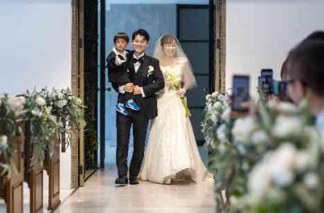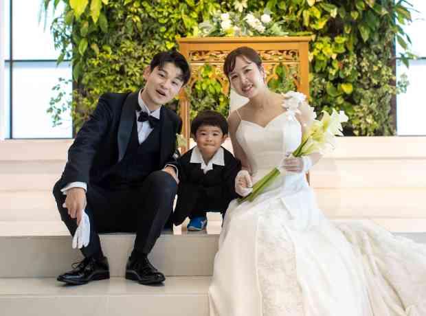 人前式がいよいよスタート!扉がオープンするとお二人とお子様の3人で仲良くご入場☆ 大切な方たちに見守られながら一歩一歩バージンロードを歩かれるお二人♡ 人前式だからこそゲストの皆様との時間を大切にしながら進めることのできるお式は、心温まる和やかな雰囲気の中、素敵な思い出の一つとなる特別な時間が流れていきました・・・。